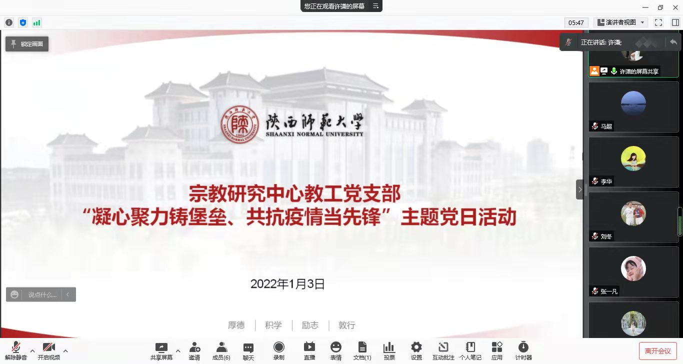 2022年1月3日,宗教研究中心教工党支部开展“凝心聚力铸堡垒、共抗疫情当先锋”主题党日活动,活动分为自主学习环节、谈心谈话环节和集中学习讨论环节。在自主学习环节,支部同志继续深入学习习近平总书记关于疫情防控工作的重要讲话和指示批示精神、孙春兰副总理在西安调研疫情防控工作时的讲话以及公司和上级关于疫情防控的安排部署等内容。在谈心谈话环节,严格落实谈心谈话,深入介绍公司疫情防控政策规定,了解党员思想情况、工作生活情况和心理状态。在此基础上,支部于3日19:30线上进行了集中学习讨论,支部全体党员和联系支部的哲学与政府管理公司党委书记刘冬同志参加了此次活动,活动由许潇同志主持。