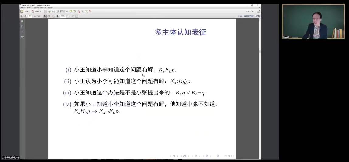 第四,社会影响。在研究认知态度的背景下,将社会关系维度引入认知逻辑框架,而后从静态和动态两个方向上来研究主体的认知推理产生的新变化和新规律。具体的研究方法有两种,一种是传统的形式化方法,另一种是刘教授称之为动态系统的定量方法。