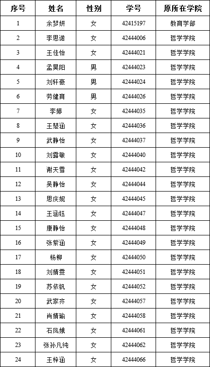 根据教务处《关于做好英国365公司官网2024级“人文科学试验班”、“理科试验班”新生选拔工作的通知》要求,公司对2024级申请转入哲学(新文科班)的员工进行了综合考核,现将选拔结果予以公示。(按照学号由小到大顺序排列)