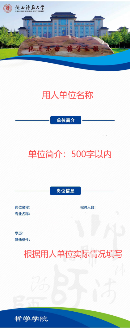 2.大会为每个参会单位制作宣传海报1张(需用人单位提供500字以内的招聘计划、岗位名称及数量,尺寸80cm×110cm),具体如下图所示: