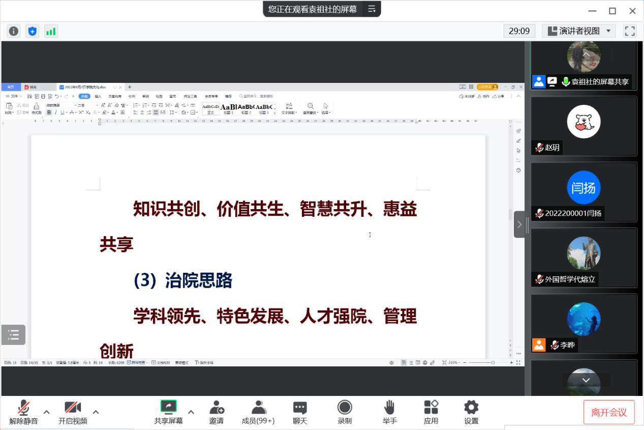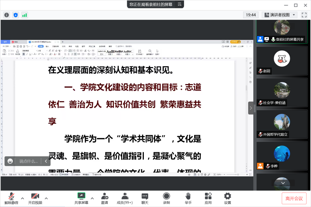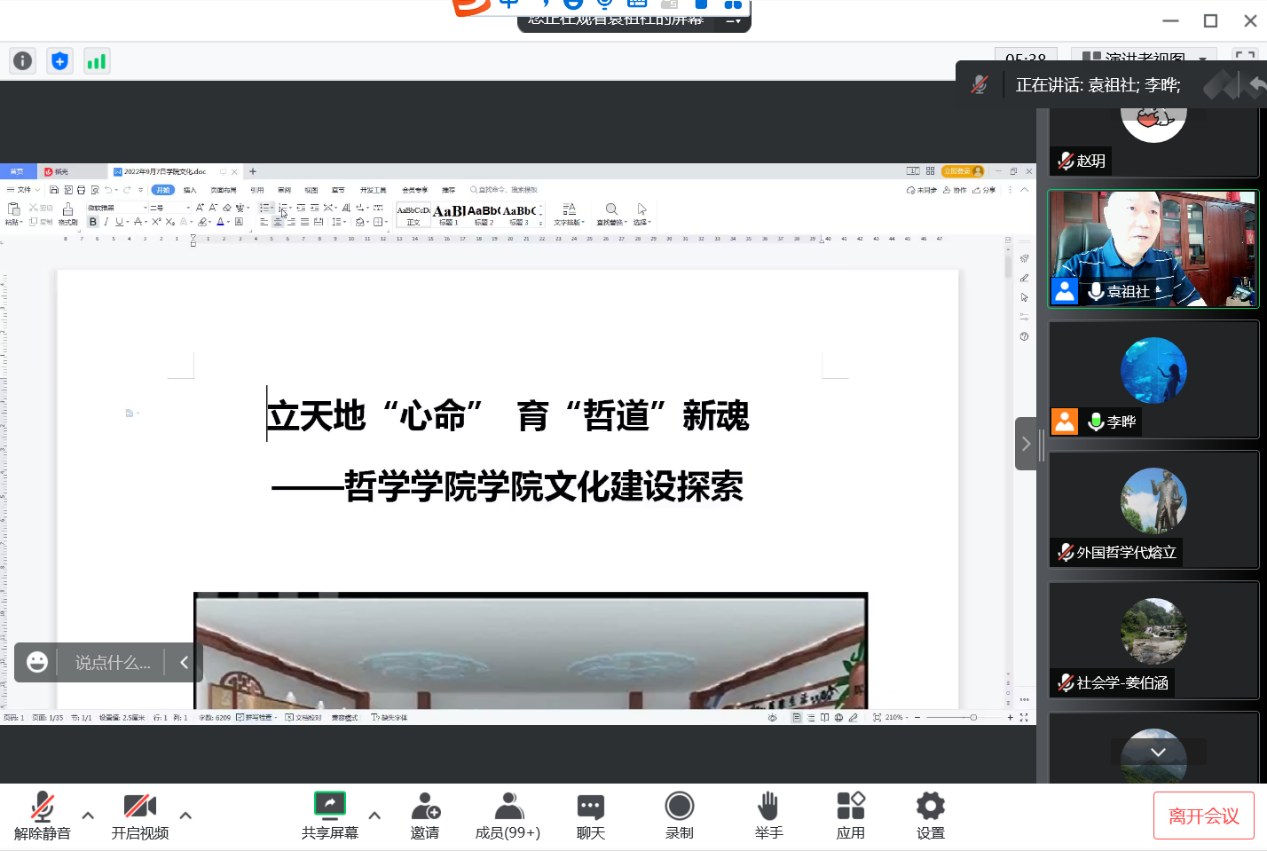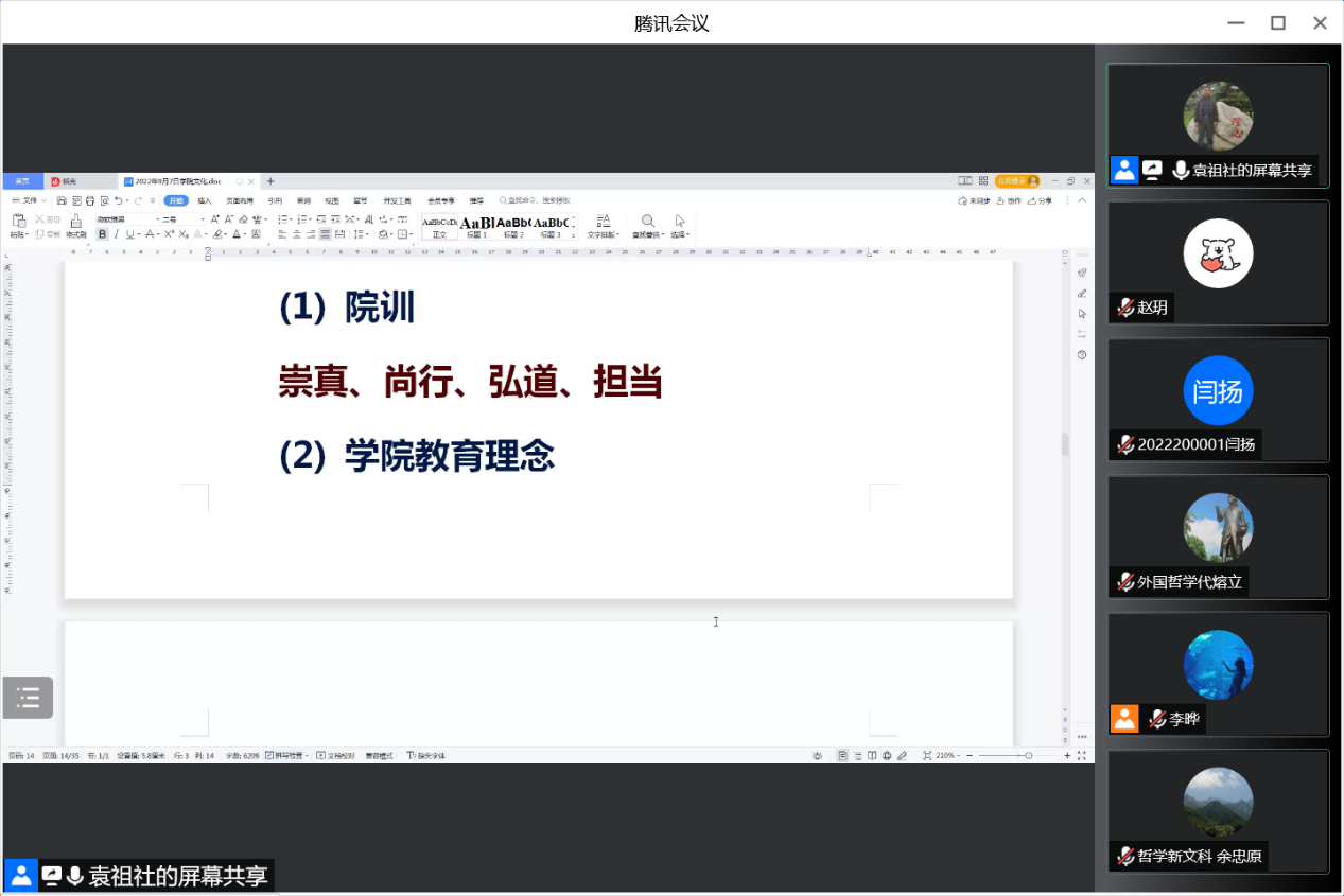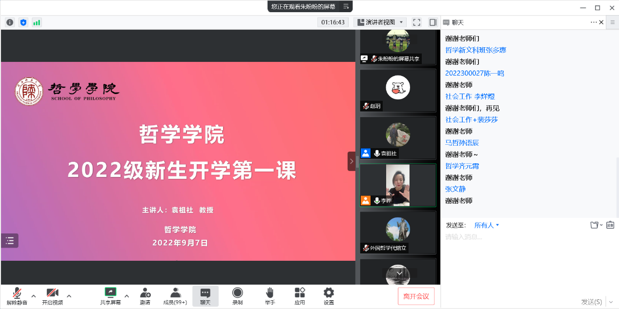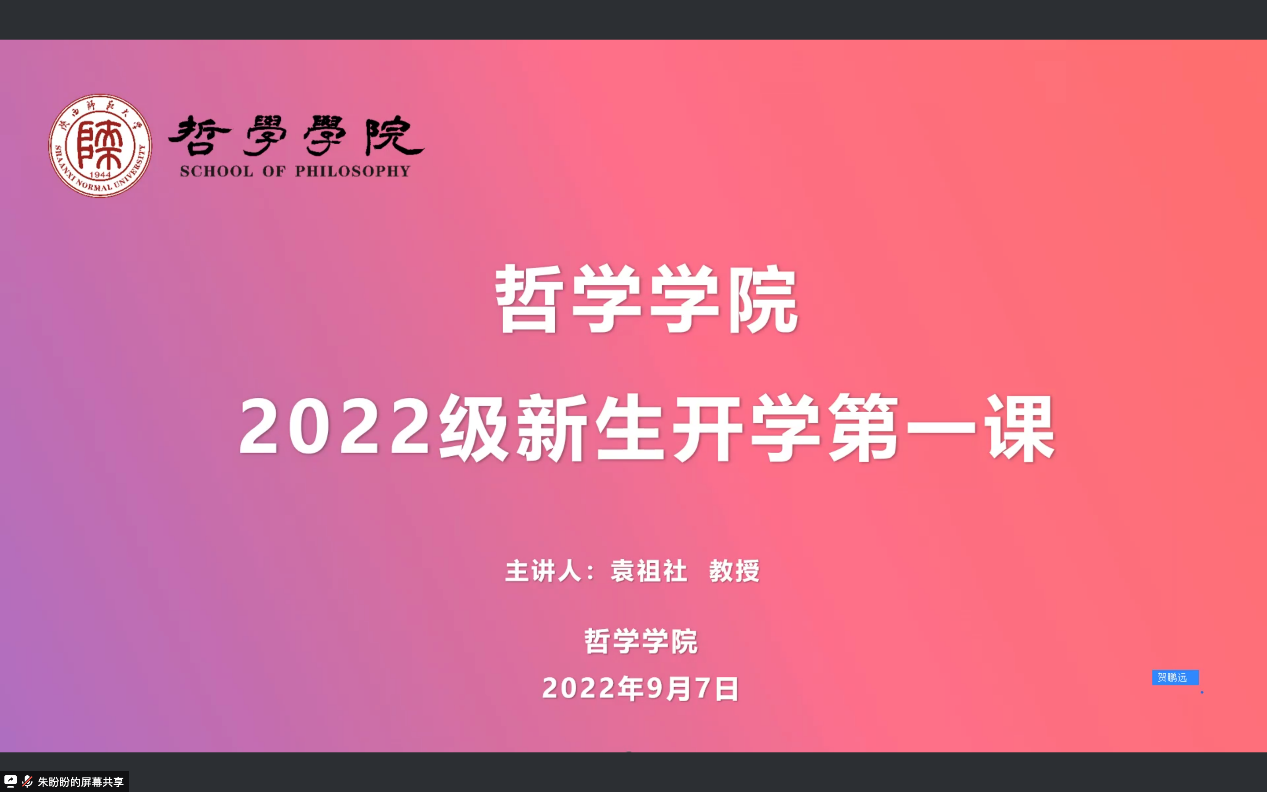 李晔在总结中感谢袁祖社教授的精心准备和精彩讲授,并表示,2022级新生作为新入院的哲院人,了解公司的历史、文化、院训、精神是非常必要的,同学们要了解、熟悉、融入哲公司这个大家庭,融入陕师大这片热土。今天,我们以哲公司为荣,哲公司未来的成长与发展将由同学们传承与续写。同学们纷纷表示,定将公司的精神内涵内化为自己的价值遵循,在新的学习阶段,与公司共同成长进步,共同开创崭新的、灿烂的明天!