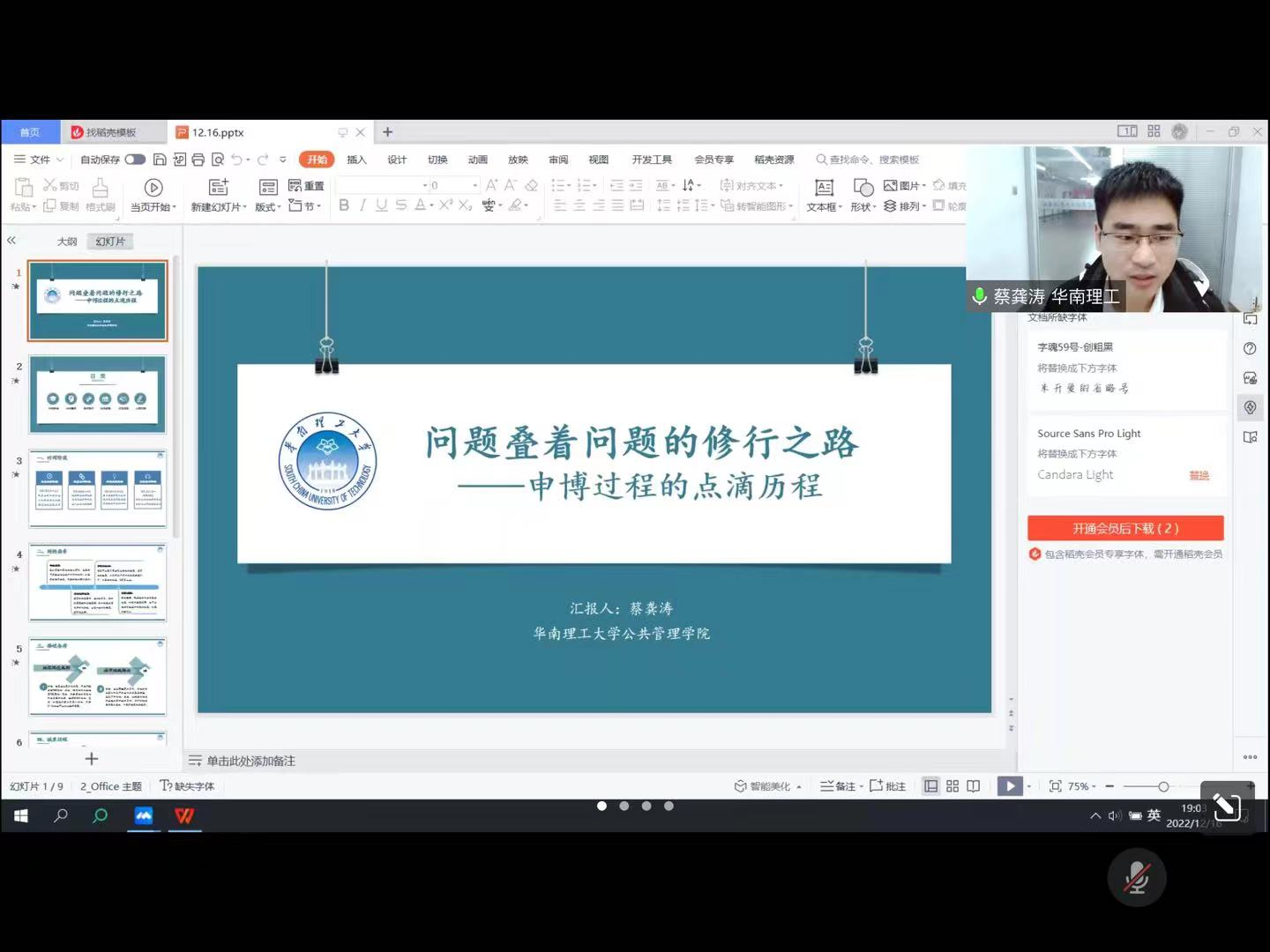 首先,由蔡龚涛来分享自己申博经验。他以“问题叠着问题的修行之路——申博过程的点滴历程”为题,并结合自己在申博过程中的亲身体会,从时间阶段、材料要素、择校备考、联系过程、结果选择、心态预期这六个方面展开了此次分享。