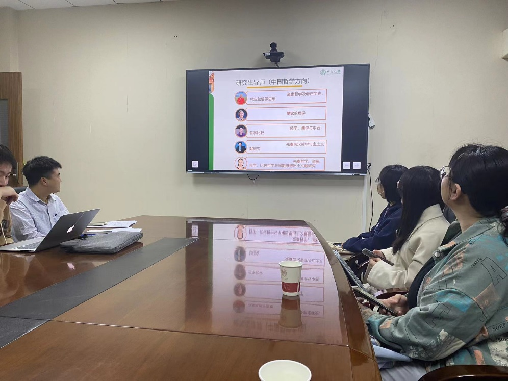 邓老师首先从历史发展、校区分布、学科排名等方面介绍了中山大学的总体情况,然后从团队力量、国际化发展状况、发展定位、学科方向、研究生导师情况、奖学金分配、招生时间安排、国际交流项目等方面全面、详细地介绍了中山大学哲学系(珠海)的情况。
