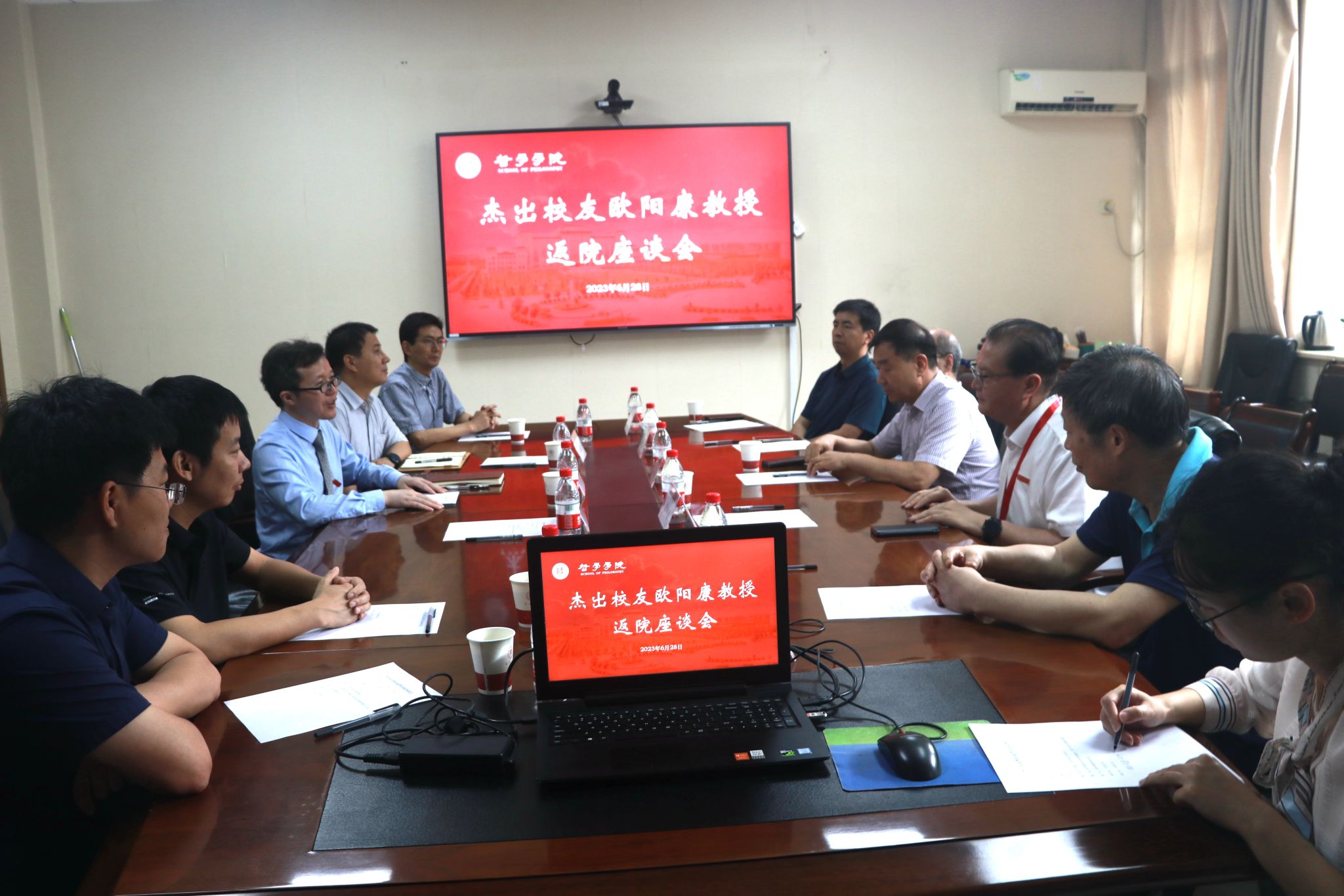 2023年6月28日上午,公司在公司会议室召开杰出员工欧阳康教授返院座谈会。欧阳康教授、公司党政班子成员、各系(中心)主任、教研室主任、教师党支部书记以及教师代表等参加了座谈会。座谈会由石碧球副经理主持。