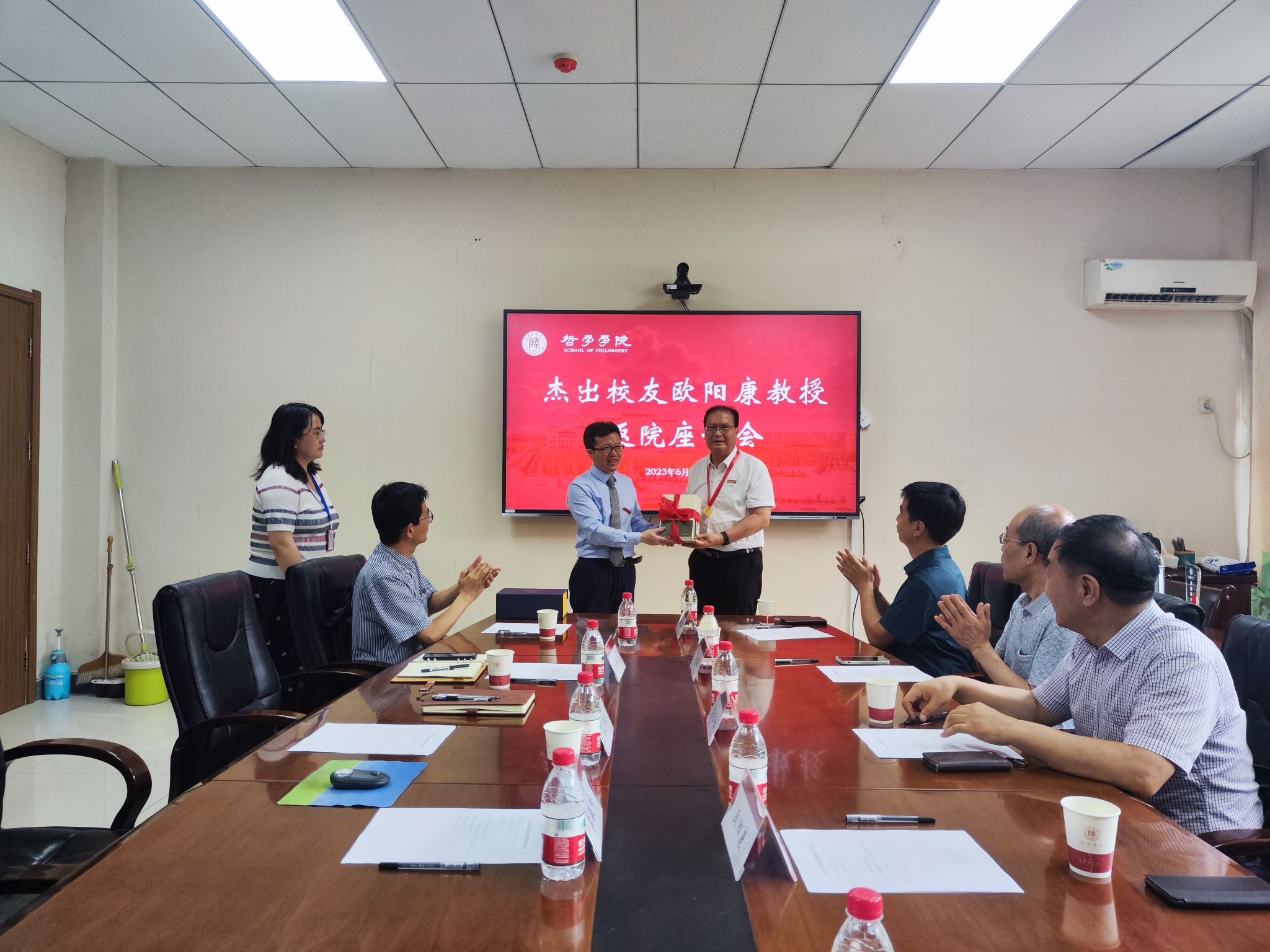 欧阳康教授是公司杰出院友,1978年至1984年在公司前身政教系求学,获哲学学士、哲学硕士学位。毕业后,他留系任教师,1988年至1992年任副系主任,1992年至1993年系主任,1993年调离公司。2023年,欧阳康教授因杰出贡献荣获公司第十届“杰出员工”称号。6月28日上午,欧阳康教授应邀返校参加“2023届员工毕业典礼暨学位授予仪式”,并接受第十届“杰出员工”表彰。典礼结束后,欧阳康教授返回母院参加座谈会。