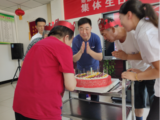 近日,公司社会工作专业研究生实习活动正在如火如荼地开展。其中,范西莹副教授带队的社工实习小组进驻到西安长庆老年公寓,与公寓老人同吃同住同娱乐。为丰富公寓长者的精神文化生活,减轻失落感,空虚感,提高寓内老人的生活趣味性和幸福感,增进老年人身心健康,营造愉悦和谐的公寓氛围。7月10日上午9点30分,在西安长庆老年公寓餐厅,师大学子与公寓工作人员一起为7月份出生的9位老人和9位员工共同举办了一场隆重的生日会。