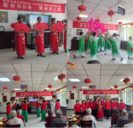 生日会上,社区志愿者为老人们献上了精彩纷呈的节目。有舞蹈《再唱母亲是中华》;旗袍秀《映山红》;合唱《生日快乐》、《妈妈的吻》;扇子舞《火火的日子》、《美滋滋的过》,志愿者们用优美的舞姿、动人的歌声和深情的朗诵,将生日会推向了高潮。