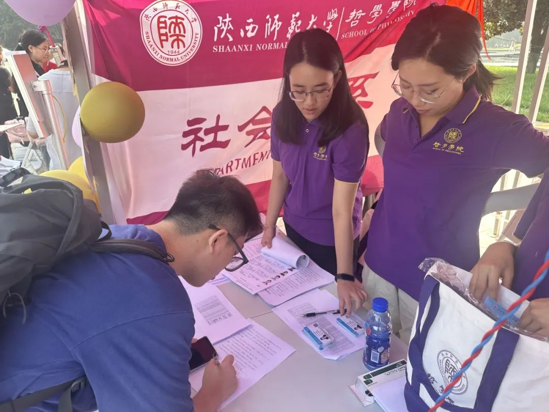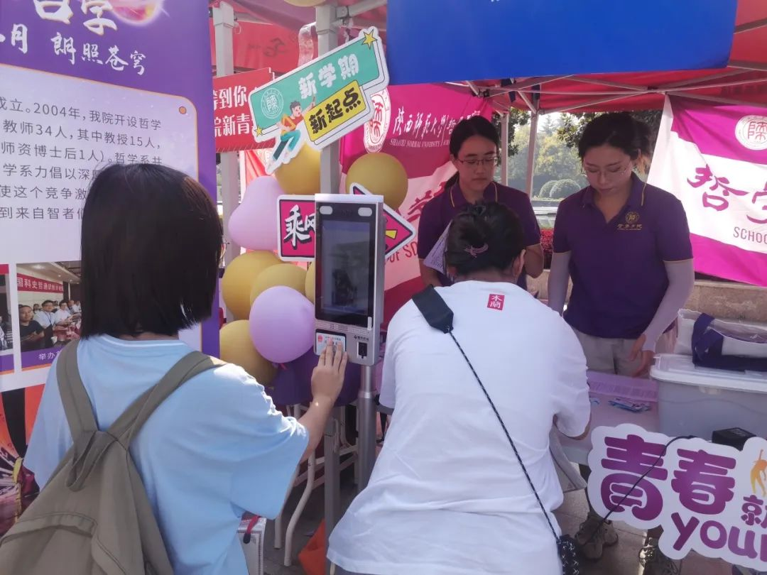 校内哲学迎新点的学长学姐志愿者们也在耐心周密地配合做好迎新工作,为同学们搬运行李,将或沉重或贵重的行李安全无误地安置在宿舍,指引带路,介绍公司里的图书馆教学楼食堂等,穿梭于校园之中,身着紫色院服的志愿者们,在微雨清风中忙碌而一丝不苟的身影,绘成最耀眼的光谱。