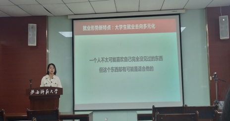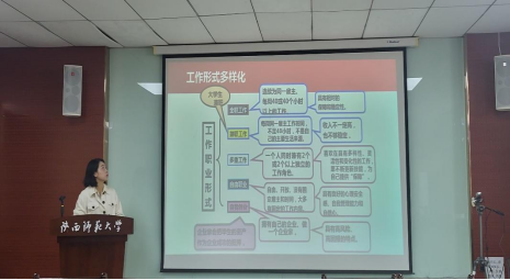 张蕾老师首先为同学们介绍了老员工就业去向的多元化情况,对国家公务员、选调生、中小学教师、企业职工等各种职业内容、职业性质和求职现状进行了简要介绍。张蕾老师强调,同学们需要提前对自己进行职业规划,并积极寻找兼职机会、丰富自己的工作经验,寻找最适合自己的工作岗位。