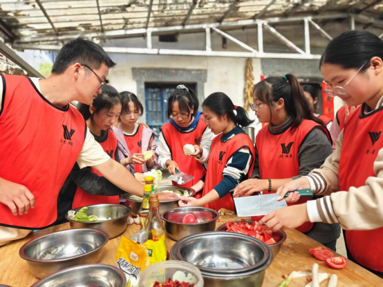 同学们体验炒菜做饭,共同品味生活。大家互帮互助,在老师的指导下分工合作,洗碗盆、切葱蒜、盛菜摆桌,最后举杯畅怀。同学感受到了“自己照顾自己”的乐趣,也学会了“照顾他人”的责任。