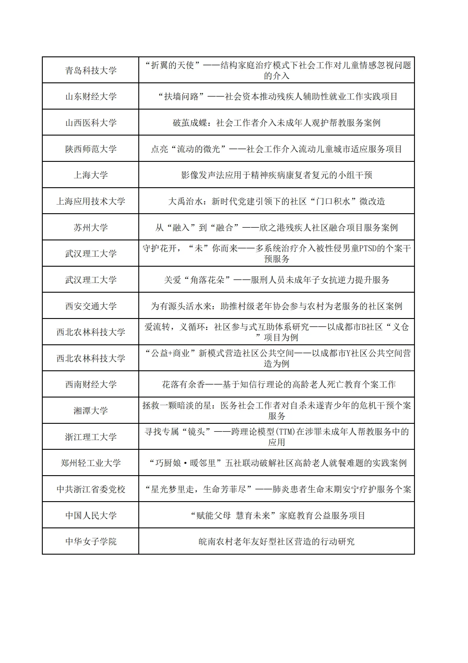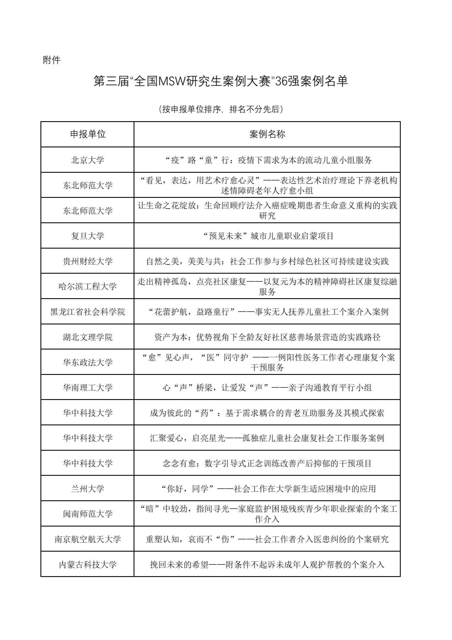 2023年10月至12月,由社会工作专业学位研究生教育院校联席会议主办,全国社会工作专业学位研究生教育指导委员会指导的第三届“全国MSW研究生案例大赛”顺利开展。本次比赛共有137所MSW公司产品单位、347个社会工作案例参与,根据综合评分结果,评选出了百强案例。