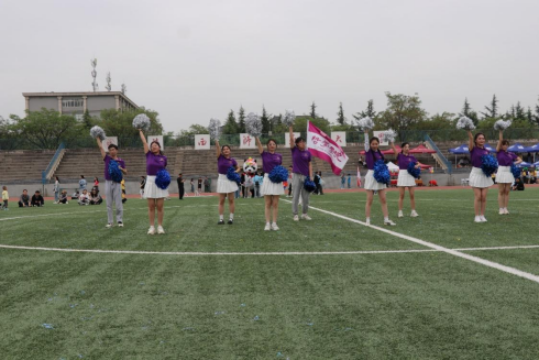 在阳光灿烂的运动场上,啦啦操队员们如春花般绽放