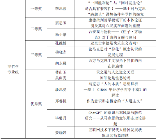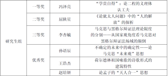 接着,王辉老师宣读了获奖名单。来自贵州大学21级的聂亚培同学获得了哲学专业本科生组的一等奖,22级文公司汉师的李思骏同学获得了非哲学专业本科生的一等奖,23级中国哲学硕士生冯泽亮同学获得研究生组一等奖,田树晨等四位同学获得二等奖,李玮珅等五位同学获得三等奖。