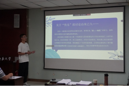 教育学部学卓2001班孔维博同学的报告主题为《亚里士多德是快乐主义者吗?》,通过考察亚里士多德在《尼各马可伦理学》中对“快乐”的定义,指出亚里士多德笔下的“快乐”不再只是单纯的情感体验,而是人通往幸福的必要元素。两位老师肯定了他的切入点,并建议他参考一些相关的二手文献,补充完善文章的论证。
