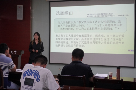 文公司汉师2202班吴雨雯同学报告的主题为《原罪论是性恶论吗?》,文章通过原罪遗传的分析与对奥古斯丁自由意志说的探讨,指出奥古斯丁的人性论并非所谓纯粹的性恶论。两位老师肯定了她对于奥古斯丁思想的解读,但也对文章的论证提出了一些批评。