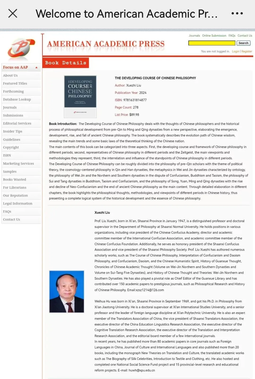 近日,公司文科资深教授、博士生导师刘学智教授的专著《中国哲学的历程》英文版由美国权威出版社——美国学术出版社隆重推出,将在全球发行。