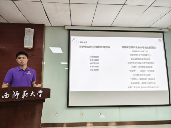 两位同学从自身丰富的经验和专业的视角,为新生们介绍了研究生会的组织架构和工作机制。详细介绍了学术科技部、文艺体育部、权益实践部、就业发展部以及组织策划部这五个部室的主要职责,并阐述了执行主席总领、主席团成员分管、各部门分工协作的高效组织制度。