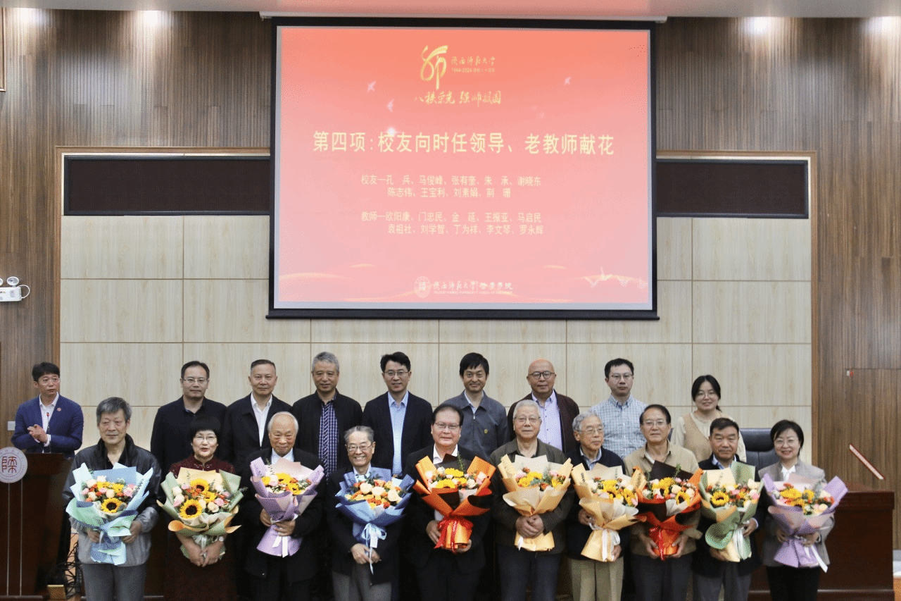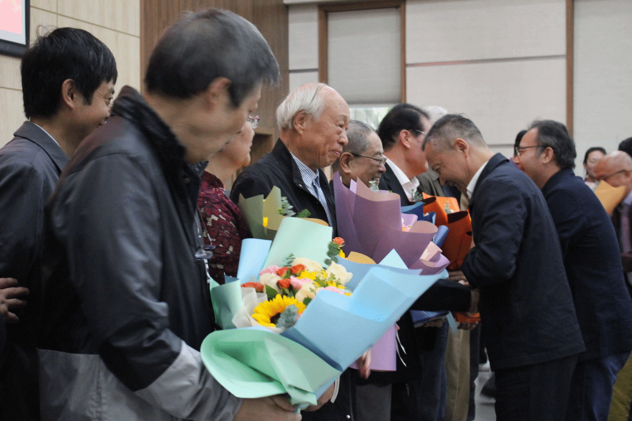 员工们向时任领导、老教师献花。