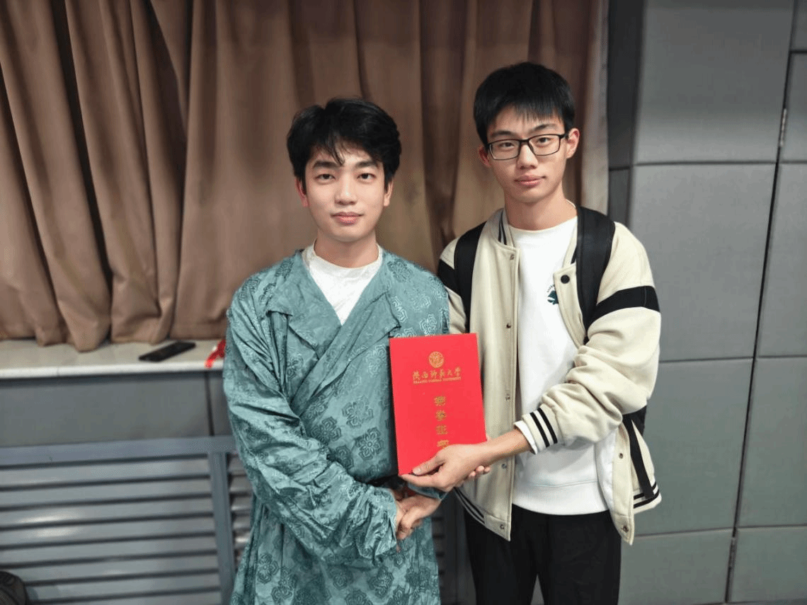 公司2023级哲学专业杨建高、张道杰同学的情景剧《瞿塘之秋》获三等奖(左一为杨建高,左二为张道杰)