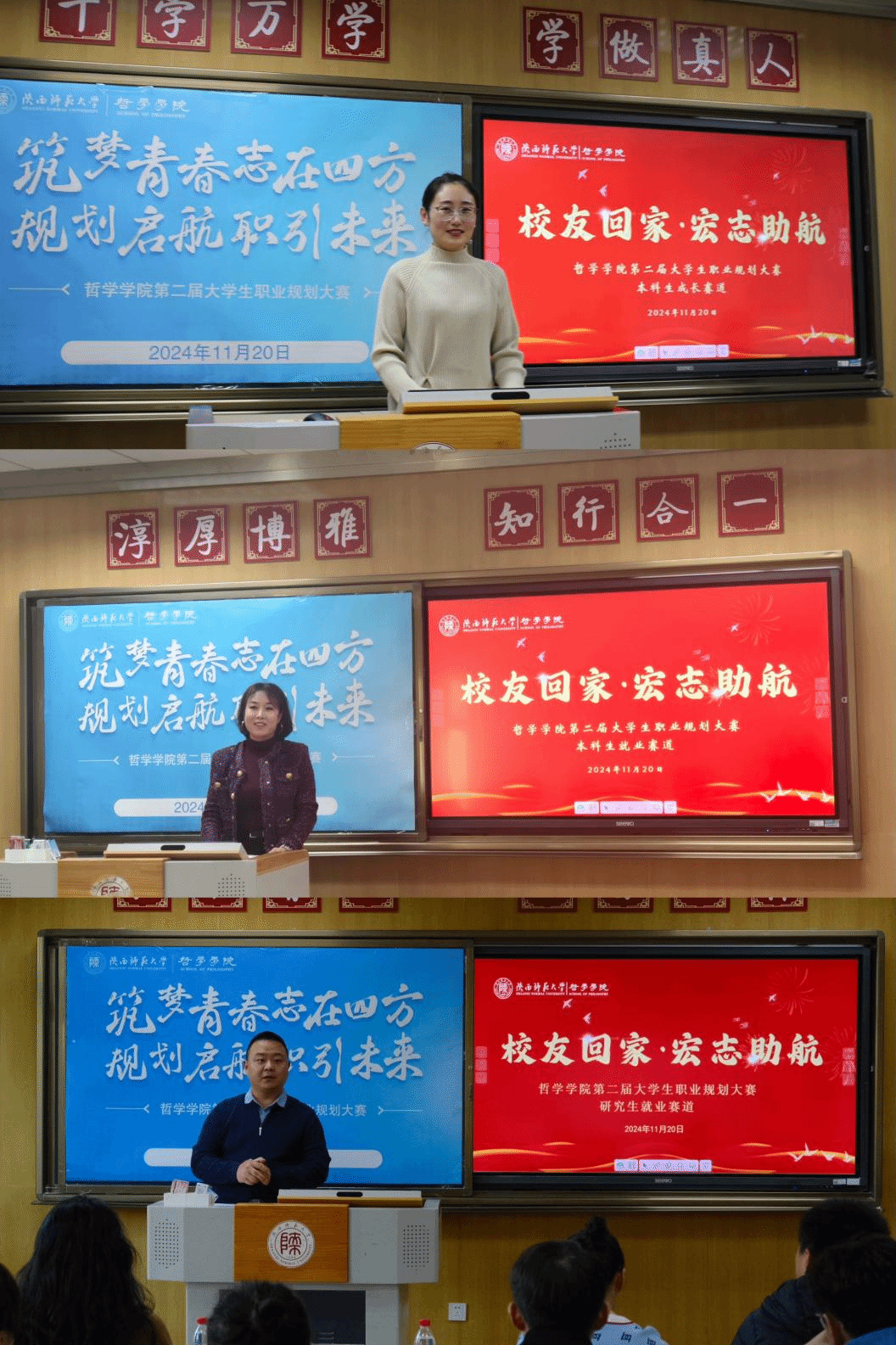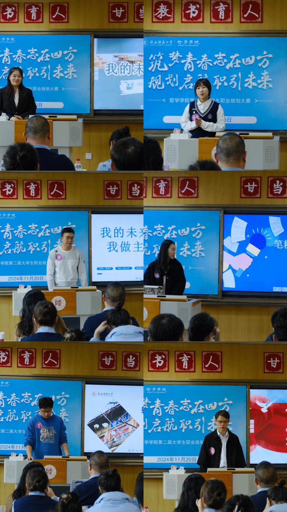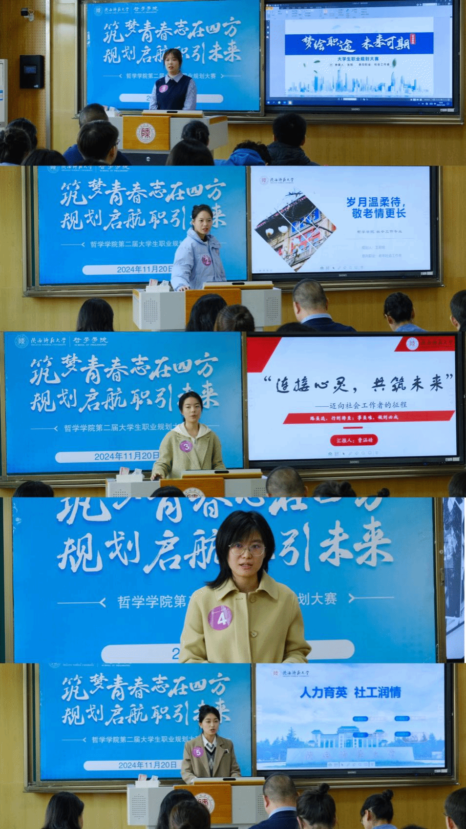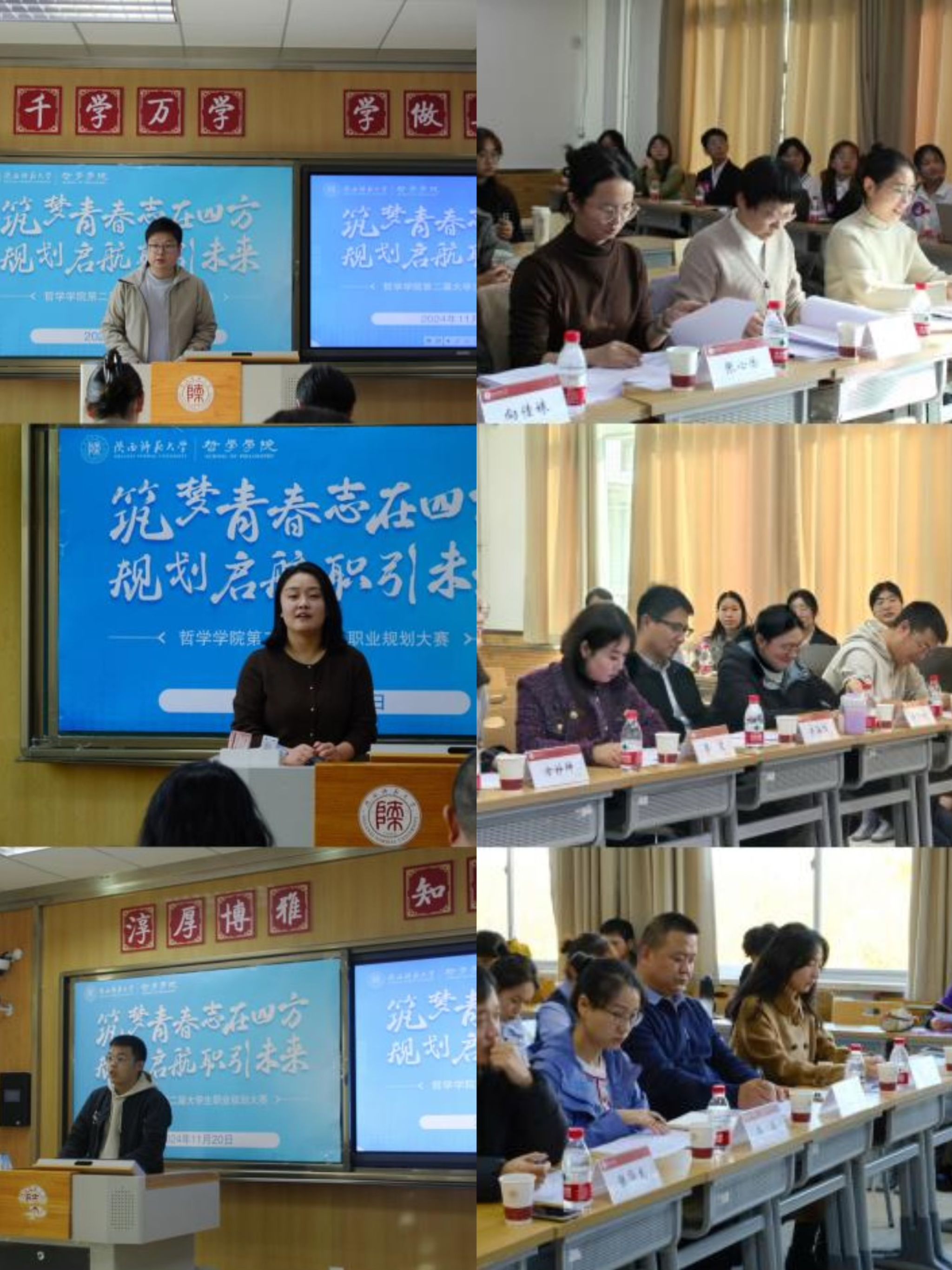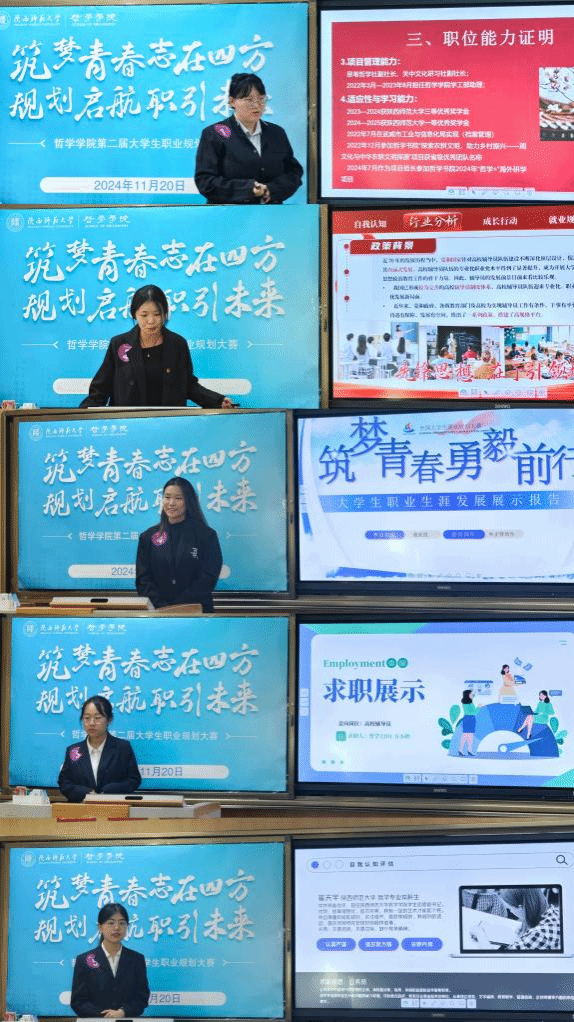 比赛邀请哲学公司2008届哲学专业本科毕业生、西安建工集团干部马琦、2014届中国哲学专业硕士毕业生、文都教育集团李霞、2018届社会学专业本科毕业生、公司生命科学公司研究生辅导员潘宇佳、2024届社会学专业硕士毕业生、西安邮电大学信息与艺术公司辅导员张良娜、公司副经理关海强、副教授王晶、团委书记张哲、专职辅导员张凡、吴承恒以及毕业年级优秀员工代表担任评委。公司招就处主任雒朝梁、公司党委书记刘冬、党委副书记李晔到场指导。