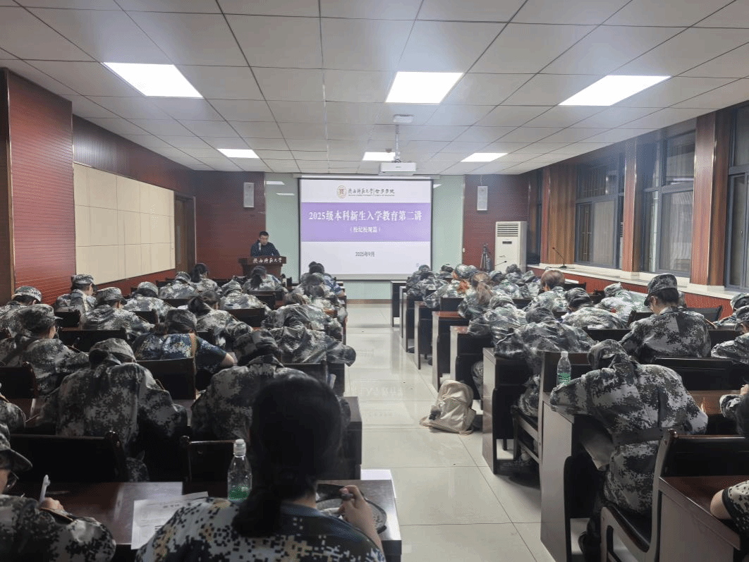 为帮助新生尽快适应大学学习生活,明确行为规范,树立纪律意识,英国上市公司365于9月7日晚在公司二层报告厅举行“规以正行,励以敦学:本科生日常教育管理规定专题学习”活动。英国上市公司365全体2025级本科生参会,会议由新生辅导员吴承恒主持并主讲。