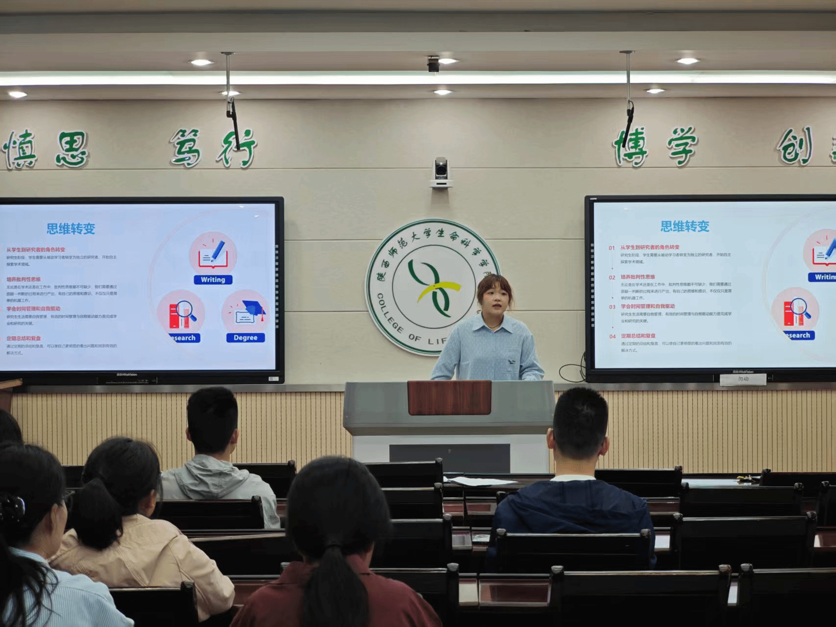经验分享结束后,新生同学集中观看由研究生院(党委研究生工作部)创作的微电影《研之有道》与《端走》。两部影片分别从科研方法指引、挫折心态调适等角度,以生动的故事、鲜活的场景传递科研精神与成长智慧,进一步引导新生坚定 “科研报国”的理想信念,以理性、乐观的态度面对研究生生涯中的挑战与困难。