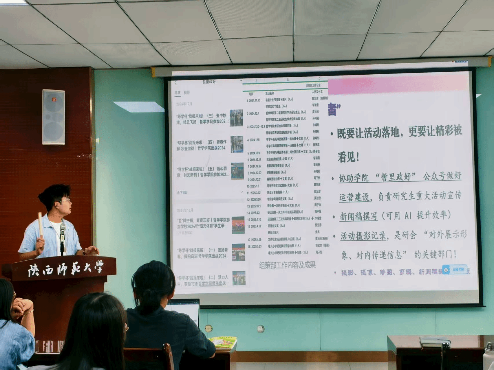宋孟林围绕 “思想引领与成长赋能”,介绍负责部门的精神传递:组织策划部以传播核心价值观、弘扬哲院学风为核心,通过新闻宣传、协助 “哲里政好” 工作室运营新媒体,宣传先进典型,更牵头建立全新活动策划制度,让员工需求成为活动设计的核心,体现民主参与;学术科技部深耕学术氛围营造,以讲座推送、论坛组织、考博经验分享助力学业成长;就业发展部搭建就业服务平台,对接企业、建立信息共享群、搜集申博信息,全方位为员工发展赋能,凝聚成长合力。