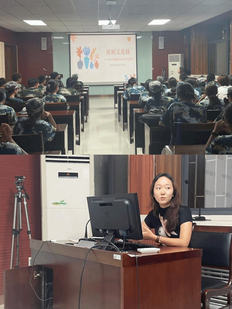 随后,来自2023级社会学专业的王梓凡围绕“大学学习内容、适应与提升方法、未来学业规划”为主题开展了精彩分享。作为国家奖学金以及挑战杯省奖获得者,王梓凡结合自身学习科研经历,深入剖析了大学学习与高中的区别,强调了自主学习和批判性思维的核心地位;她建议新生同学们尽快转变心态,变“被动接受”为“主动求索”,依托公司本科生班主任以及本科生导师制,结合图书馆、数据库等资源,通过结伴而行、互学互促等方式,在交流碰撞中深化对所学知识的理解;关于未来学业规划,她引导新生们以终为始,放眼未来,尽早思考未来发展方向,并据此规划每个学年的阶段性目标,例如考取证书、参与项目、积累实习经验等。