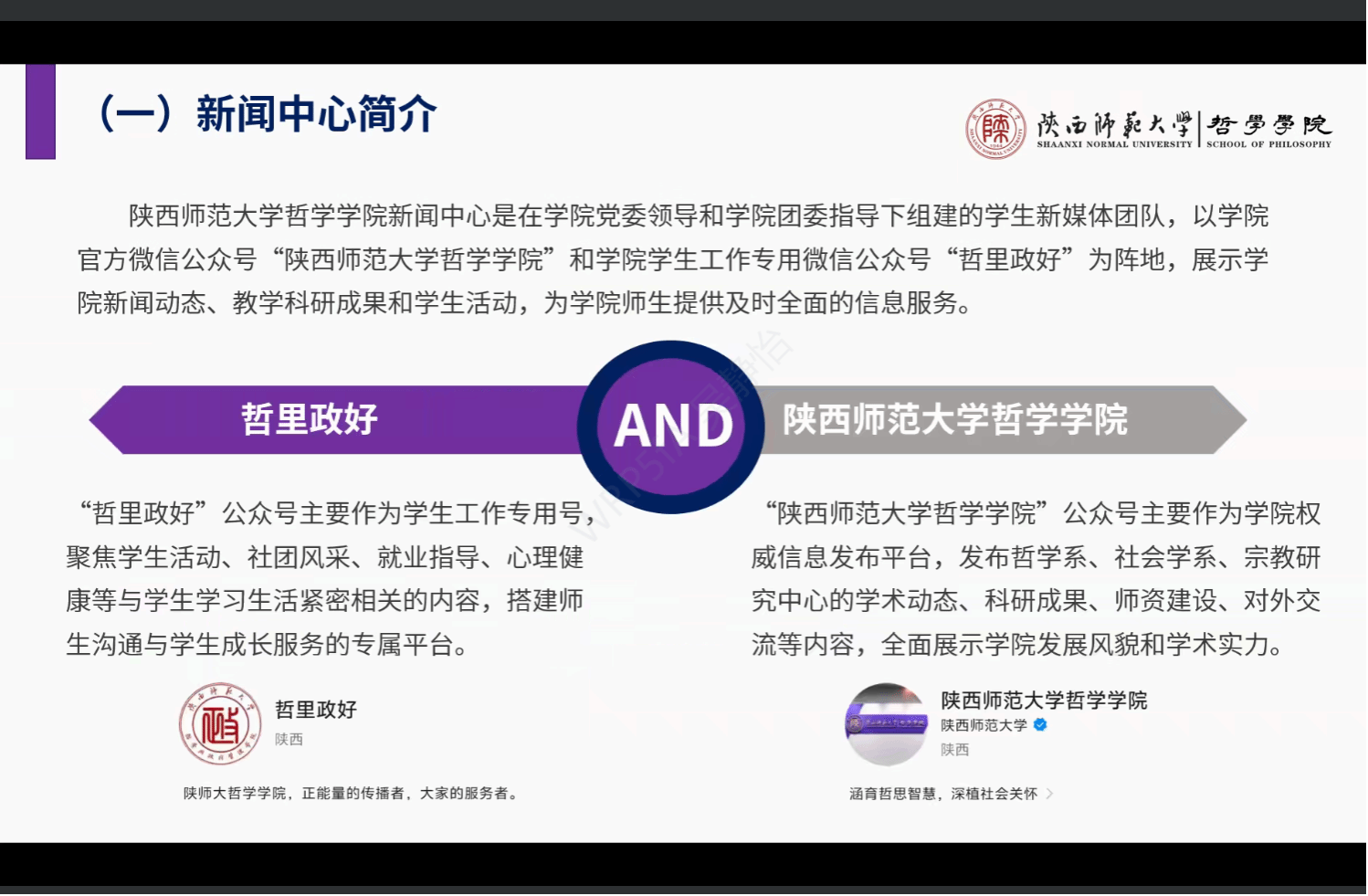 公司新闻中心主编樊姝彤从平台运营、内容生产、技能培训与团队建设等角度展开介绍。她表示,作为公司宣传主阵地,新闻中心承担新闻采写、摄影设计、编辑排版、平台运营等任务,为成员提供专业技能培训与志愿服务机会。她鼓励对新媒体感兴趣的同学加入,用文字和镜头记录公司发展,传播哲院声音与故事。