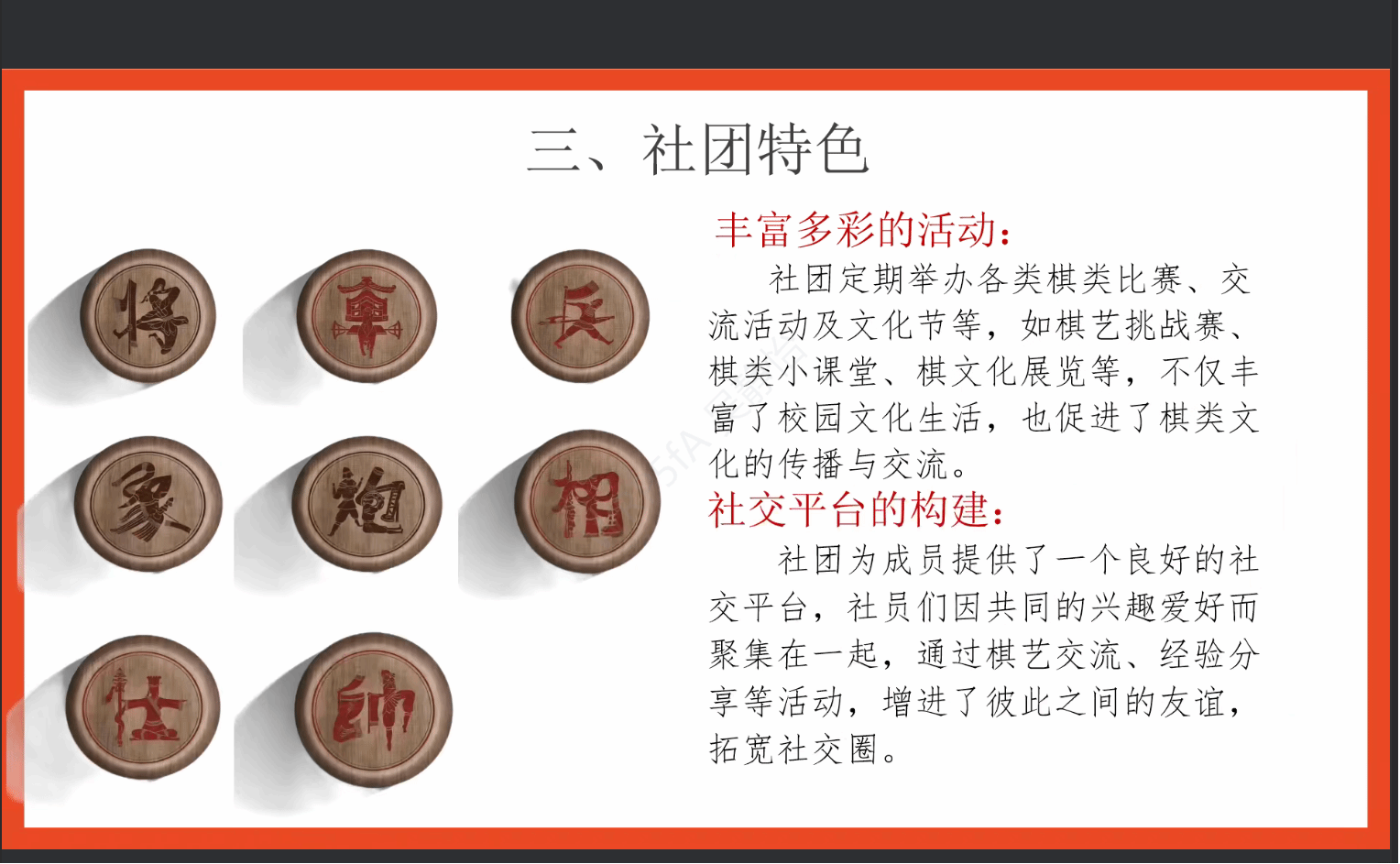 弈林棋友社负责人许佳喆以“以棋会友、启智润心”为题,介绍了社团的特色活动与文化氛围。她分享了社团日常训练、赛事组织、文化交流等方面的内容,强调棋艺活动在培养思维能力、促进交流互动方面的独特价值,邀请新生在博弈中收获成长与友谊。