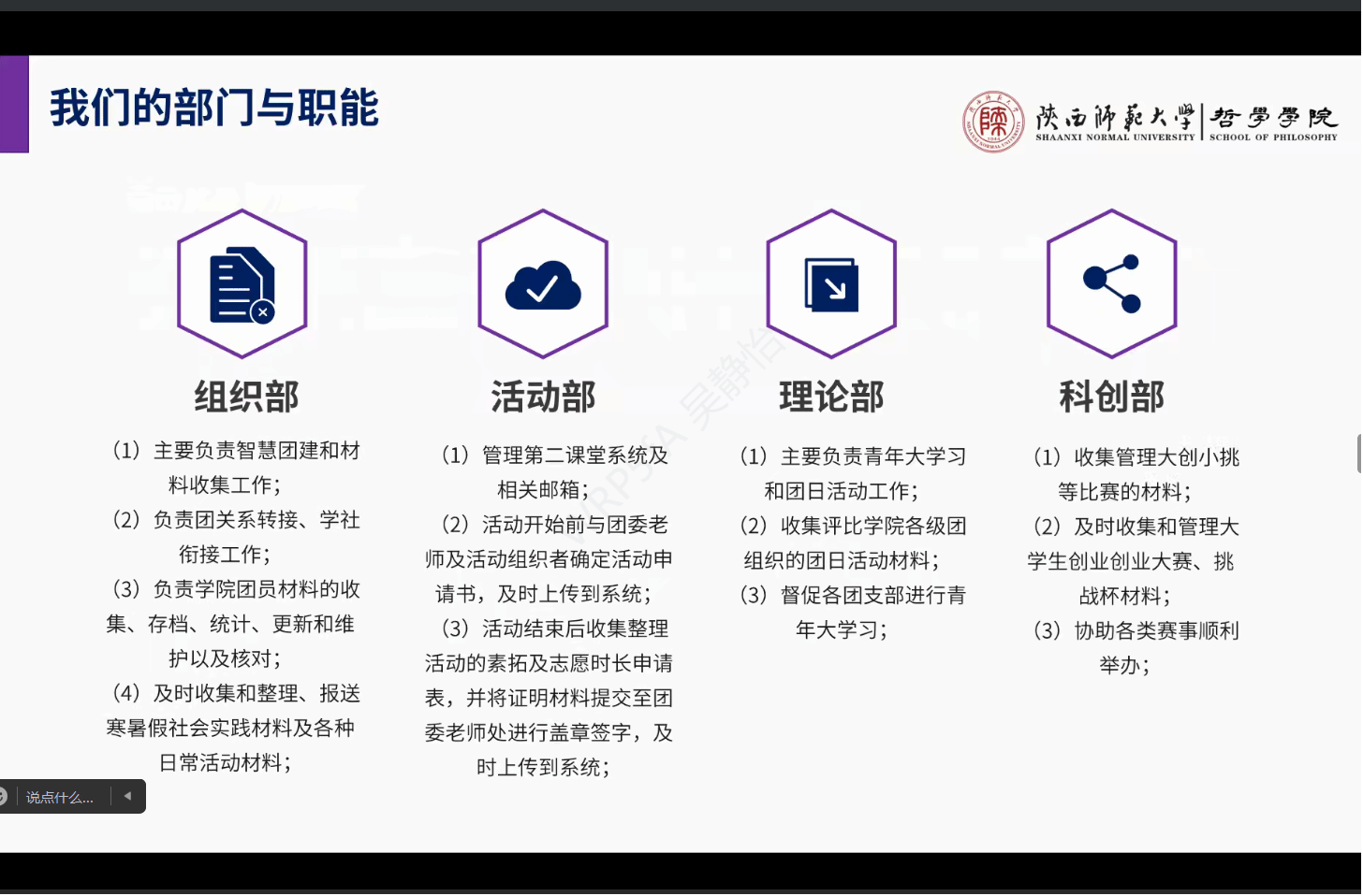 首先进行分享的是公司员工会执行主席王子仪,她围绕组织架构、品牌活动与优秀成员风采三个方面展开介绍,详细阐述了综合办公室、生心权益部、文艺部、体育部和志愿活动部的职能与特色,并通过往届优秀成员的成长故事与典型事迹,生动呈现了员工会“服务同学、成长自我”的宗旨与热血温暖的组织氛围。
