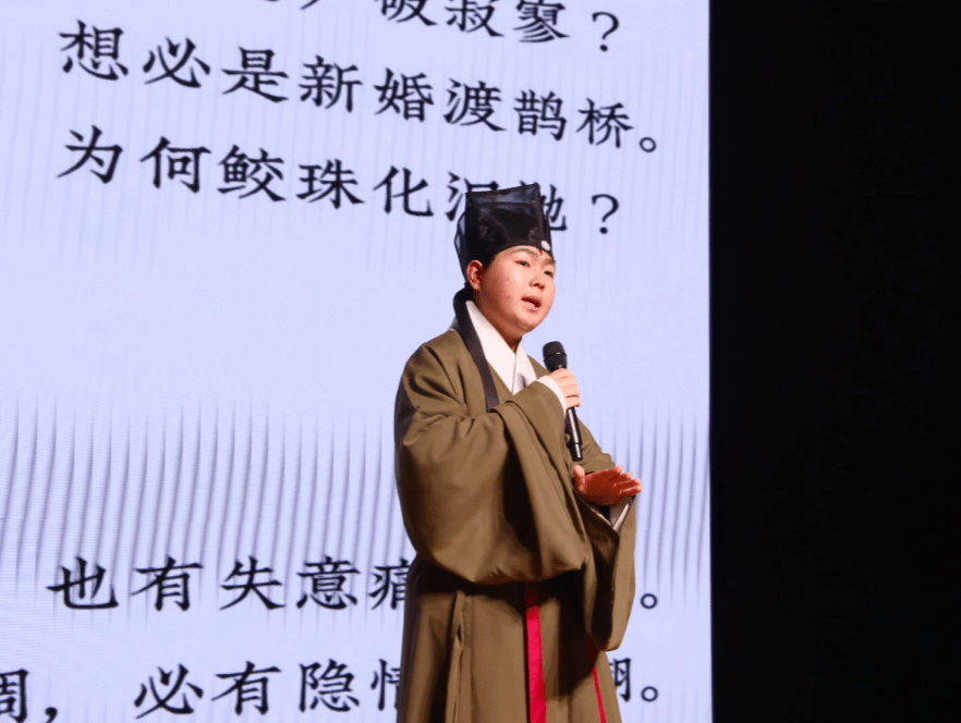 新闻与传播公司2025级本科生张正带来京剧《锁麟囊》选段,婉转悠扬的唱腔迂回绵长,道尽人间离合悲欢、人情冷暖。丝竹雅韵间,观众卸下尘世喧嚣,沉浸式感受传统京剧的独特魅力与文化底蕴。