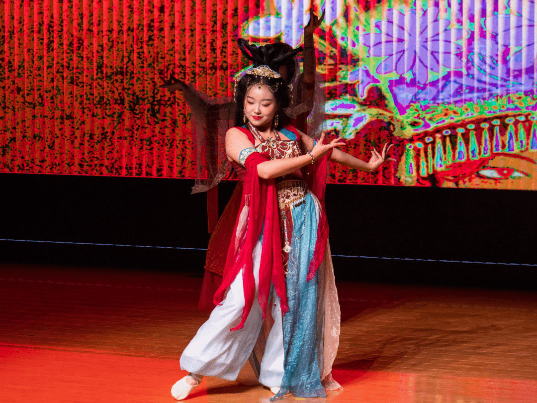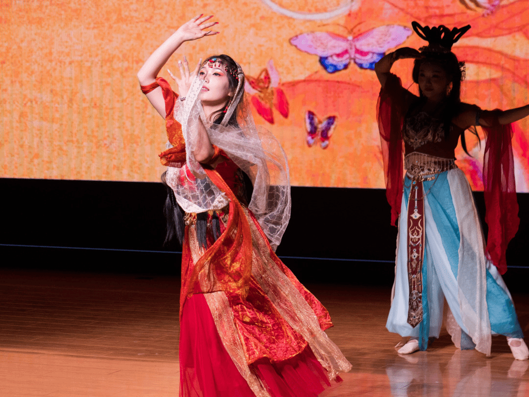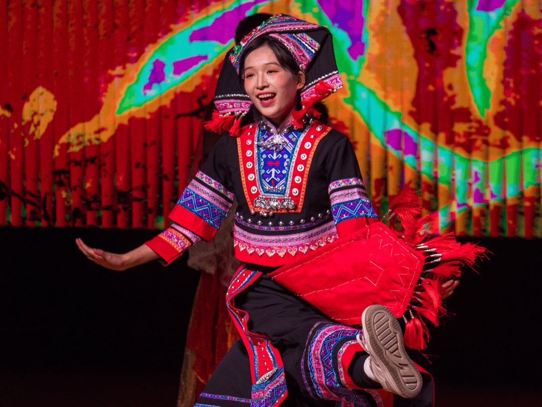 敦煌飞天的飘逸、维吾尔族舞步的灵动、壮族铜鼓的豪迈、傣族孔雀的温婉、朝鲜长鼓的轻快,在舞蹈《六彩和韵》中完美交融。公司2024级哲学专业本科生张紫涵、2025级哲学专业本科生马佳悦领衔15位同学,以翩跹舞姿勾勒出一幅绚丽多彩的民族团结画卷,用昂扬旋律传递“民族团结一家亲”的深厚情谊,共贺家国安康团圆。