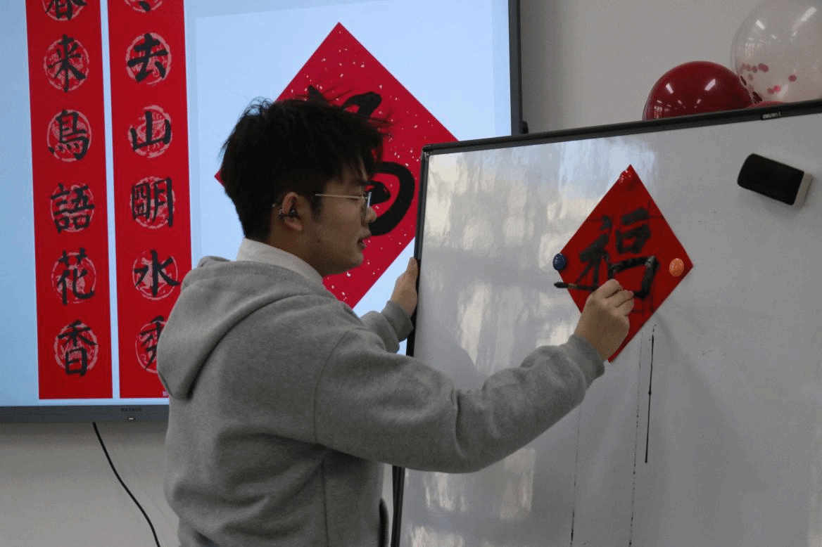 活动伊始,研究生会主席团成员宋孟林为大家带来了细致入微的讲解。他从毛笔的执握、运笔的基本要领讲起,并现场示范书写饱满圆润、骨力内含的“福”字,一起一落间,不仅传递了书法的技法,更点燃了在场每一位尝试创作同学的热情。