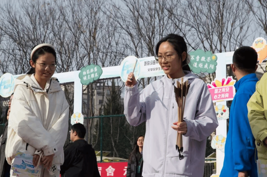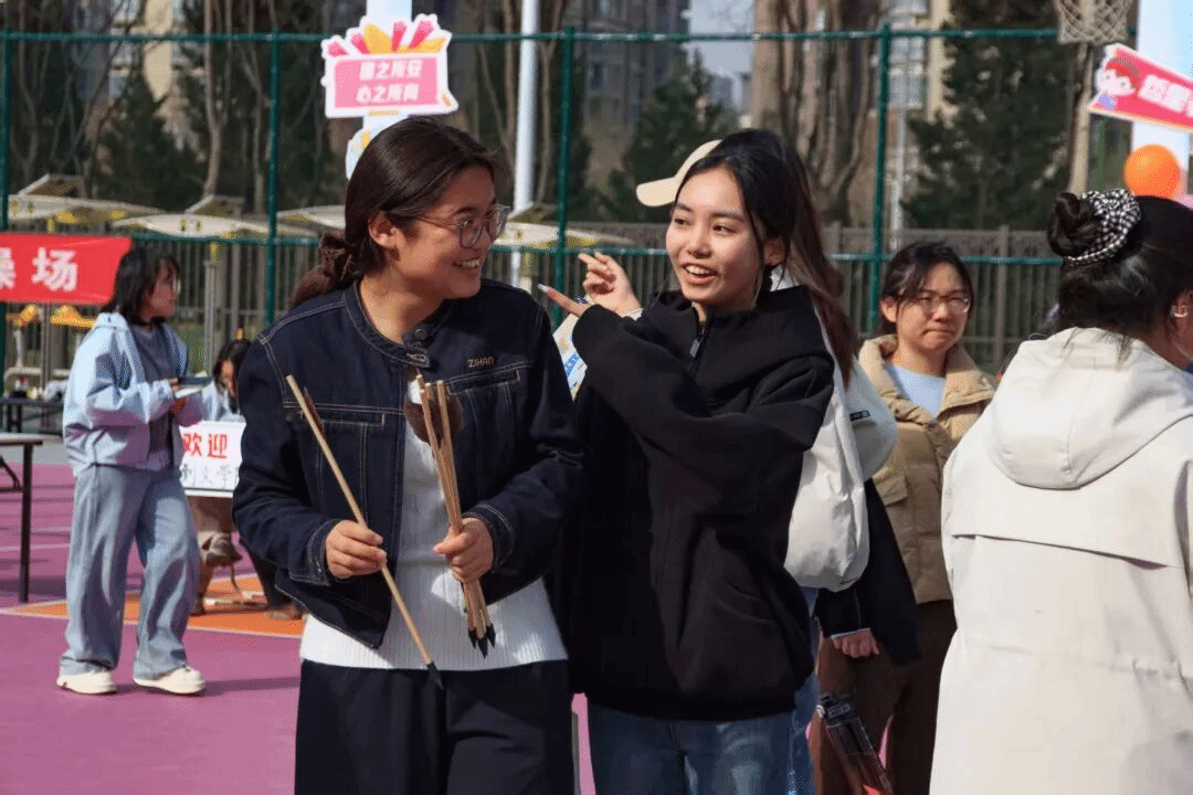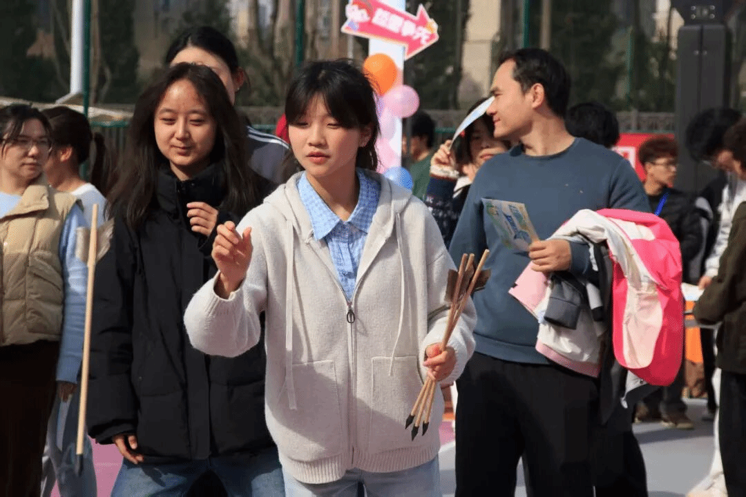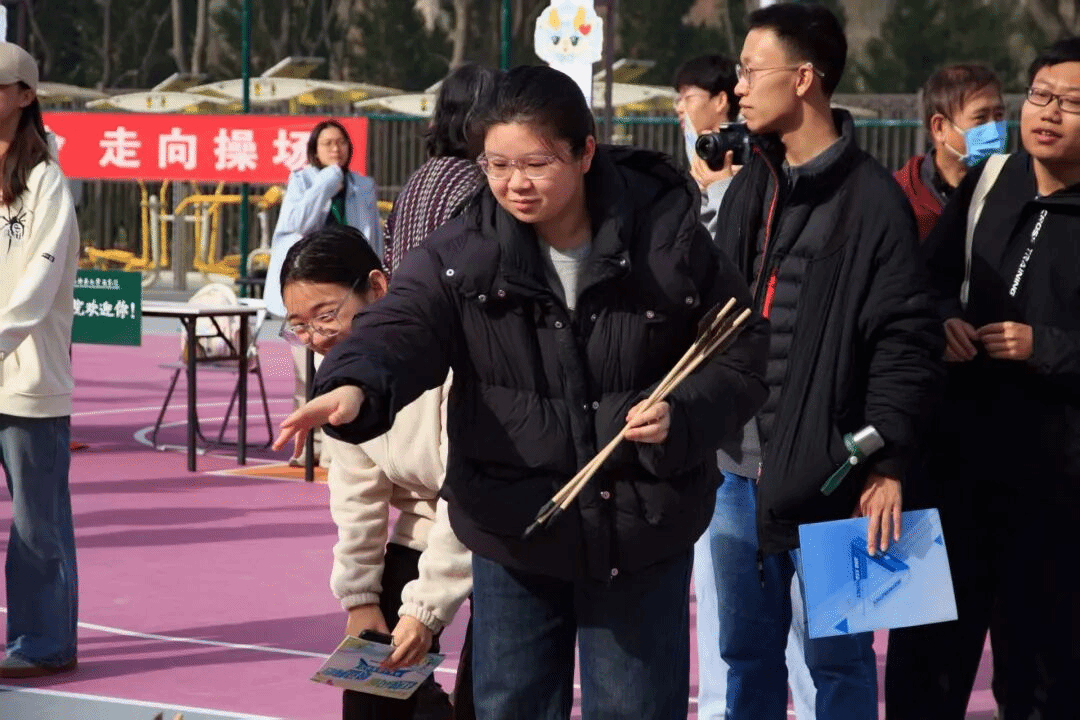 活动现场,“投壶雅趣”摊位前人头攒动。志愿者们耐心讲解规则、引导参与,同学们手持箭矢,屏气凝神瞄准壶口,既有精准入壶的喝彩,也有擦边而过的惋惜,欢声笑语此起彼伏。大家在传统投壶游戏中感受礼仪文化,在一次次尝试中锻炼专注力与协调性。